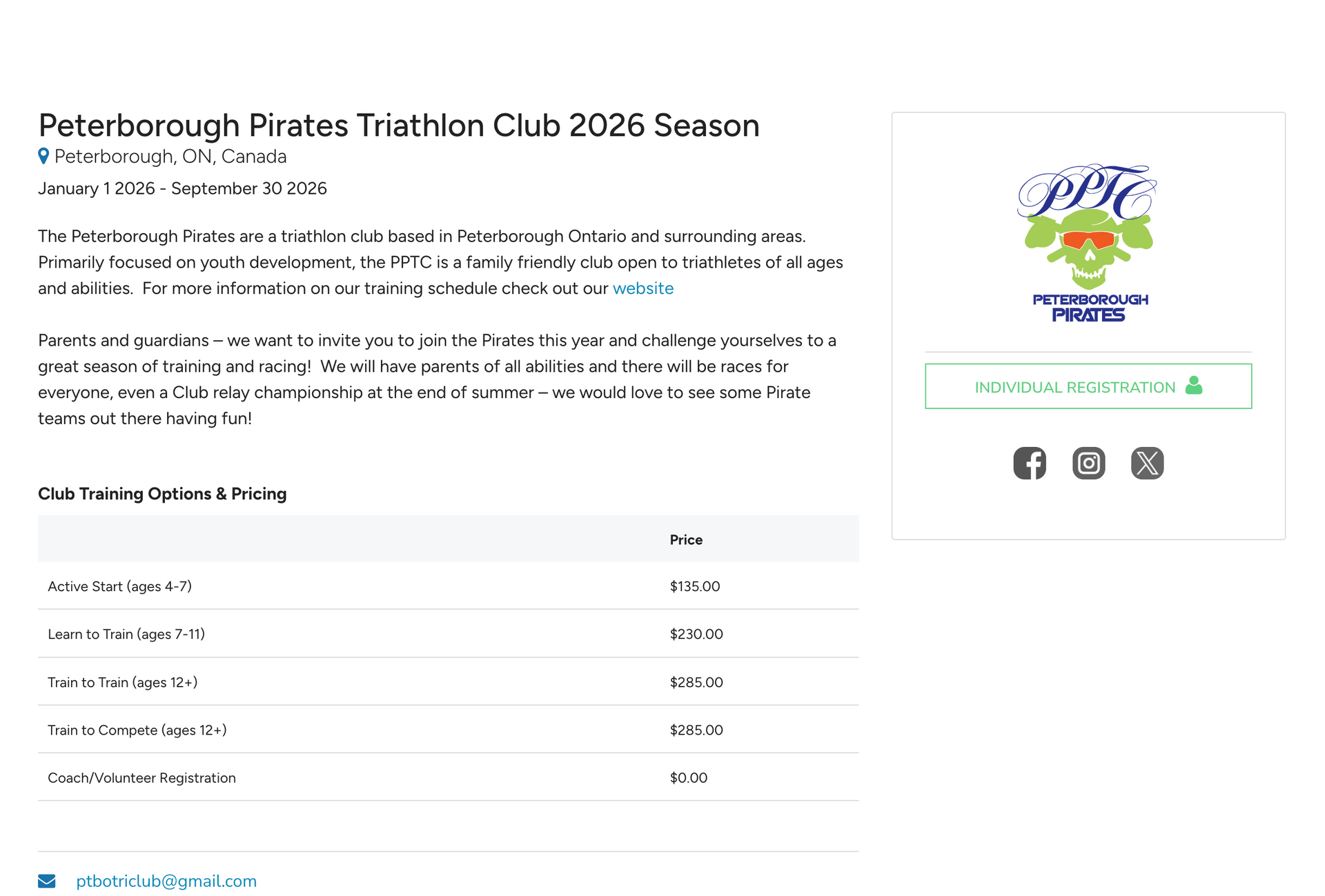 The Peterborough Pirates Triathlon Club is a youth-focused club based in Peterborough, Ontario, offering training in swimming, biking, and running for ages 4 and up. Programs are tailored to different age groups and skill levels, with a focus on skill development, confidence, and fun. Led by experienced coaches, practices are packed with games and engaging activities that keep kids active and excited. The club emphasizes safety with certified lifeguards and structured training environments, and athletes have opportunities to train year-round and compete locally and provincially.